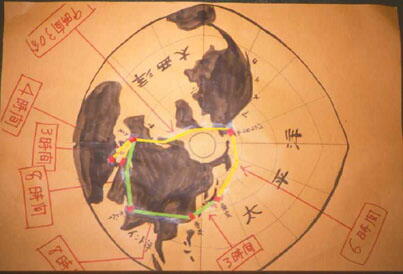 のお寿司を御馳走になった。午後すこし横になり4時すぎ、辞退するのを押し切っておばあさん が上野駅まで送ってくれた。成田で全員合流後、班編成があり、名簿の順で私は2班になり推 薦で私が班長にさせられた。班長の責任は旅行中の人員確認である。ナオミコミニュケーショ ンの下川師、ガイドの河谷氏ほか全員35名。夜の成田を離陸した。私の座席は窓際に恵ま れ快適である。30分後、機内TV表示板は時速・高度・外気温と現在の飛行地を交互に写し出 す。離陸後3−40分頃の表示は1,115k/h 8,500m -30度とあり地図は ![]()