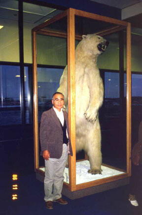 カレッジ空港では14日の午前8時58分と言う。実質6時間、飛びながらも時差の事情で17時間 も逆戻りした計算になるらしい。アンカレッジ空港は日本人が多く見られ外国である事を暫し忘 れさせてくれる程だ。私は剥製の大きな白熊を背景に一枚パチリ。みぞれ空の空港展望台か ら荒涼とした氷原や建物また自分の搭乗機にもカメラを向ける。目につくのは小型飛行 ![]()