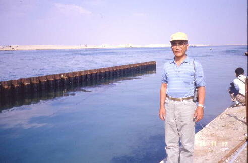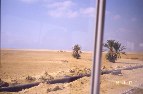 軍の基地などのある一本道をスエズに向けて走り続ける。右も左も砂漠の荒涼たる原野だ。 草、殊に木は殆どなく唯々この一本道を行き交う車のみ(それも極めて希に)が「動く物」なの である。途中、道の真ん中にロバが二頭立ち止まっている。車が近づいても逃げようともしな い。