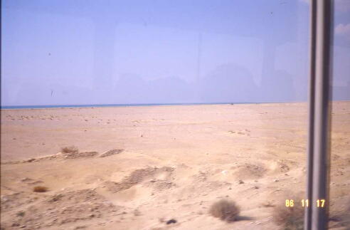る。以前は考えられなかった"砂漠を沃野とする開拓作業の一つだ"という。「荒野をサフラン の花咲く所とする」(イザヤ35:1)聖書の予言が今や着々と進められている。時折ポツーンと見え る遊牧民の粗末な小屋の群の中でひときわ目を引くのがモスク(回教寺院)の鉄筋の立派な 家である。モスクは彼らにとって公会堂であり、憩いの家であり祈りと学びの家であると言う。 一体誰が建て、維持しているのだろうか?ふとそんな考えが過ぎるのも教会を建て維持管理 に苦労する島国日本の貧しい牧師である私の本音だろうか。遊牧民はおよそ4万人ぐらい居 ると言う。この砂漠地帯、全く何もない。もしこの道と往来する車(それも極めて少ないが)がな ければどんな風景になり、どんな生活になるのだろうか。その糧はどこから得るのだろうか。7 月ともなれば気温も50度を越すと言う、こんな所で過酷な生活を生きる人達ど根性を思う。そ んな思いをよそに茶色の砂漠と真っ青な海と空がどこまでも続く。 ![]() ![]()