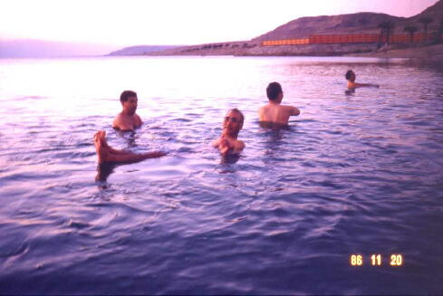 位は冷たいがその下は温泉のような温かさである。何でも昼の太陽で海水が温まっているらし い。とにかくちょっと指をつけて海水をなめてびっくり。塩辛いどころか苦いのである。海に入り 腰あたりまでになると"ふわー"と浮いてくる。もう少し進むと完全に足が浮き横倒しになってし まう。足の方が軽いからだ。メガネをしたままなので海水につけないように注意するのだが体 の自由が効かない。まるで宇宙遊泳しているようだ。何もしていないのに完全に浮いてしまう。 子供の頃、傘をさして死海で寝て本を読んでいる写真を見た記憶があるが、今まさにそれであ る。立ち泳ぎする者、足と頭を水面に上げて寝る者、その中7〜8人で手をつなぎ足を真ん中 に集めて海中人形菊を作ったりして下川師のビデオに収まったりした。 ![]() ![]()