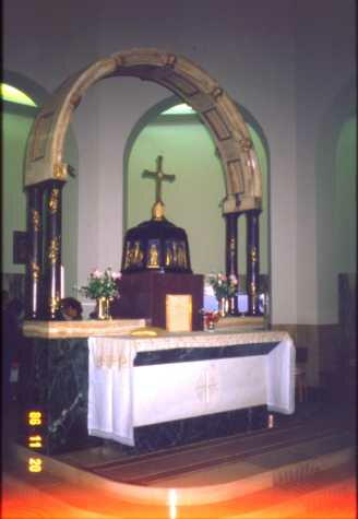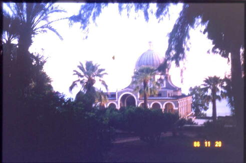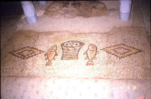 この教会は最近建て直したそうだが床にある" パンと魚"のモザイクは昔のもので有名なもの との事だ。その他大切な所は昔のまま保存されているとか、モザイクは水を掛けると美しく甦る そうだ。また回廊があり、奥が部屋で二階にも部屋といったこの形式の建物は、昔の隊商たち の宿からヒントを得て作られているとか。馬やロバを繋いだ回廊、奴隷や下僕たちの宿は一 階、主人は二階というのだそうだ。この教会の売店で五つのパンと魚がデザインされている皿 と此処でしか売っていないというガリラヤの地図を買った。 ![]()