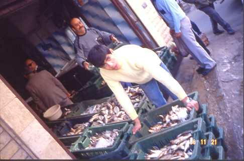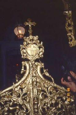 排水路なのか、4〜50センチの溝が通っている。その時水はなく一段低い歩道の感じだった が。肉屋、魚屋、小間物、雑貨、貴金属店、本屋、とありとあらゆる店がぎっしり詰まり人通りも 多くて前の人を見失うまいと必死で曲がり角の多い路地を歩く。とうとう途中で道を間違えて大 声で呼び戻される有様。ようやく辿り着いたナザレの会堂はひっそりと静まり返り人気もなく、 通りとは正反対の雰囲気を醸し出している。予想外に狭く小さな石造りの地下シナゴクの感 じ。イスラエルの教会を訪ねて感ずるのは入り口の狭いことだ。入ると階段を下りて地下に潜 る感じであること、そこに関係のある絵が飾ってあること、2、3の教会を除いて出入り自由(無 料)であることなどである。 ![]()