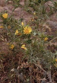 写真と斜体の解説文は、廣部千恵子氏のホームページ「聖書の植物」から同氏の許可によ り掲載。詳細はホームページ、 http://www2.seisen-u.ac.jp/~hirobe/2002thorn6.htm または、「新聖書植物図鑑」(廣部千恵子著、横山匡写真、教文館発行)をご覧下さい。 「「レバノンのあざみが、レバノンの杉に使者を送って、『あなたの娘を私の息子の嫁にくれない か。』と言ったが、レバノンの野の獣が通り過ぎて、そのあざみを踏みにじった。」(列王記U 14:9) ![]() れも大きなとげのあるあざみとしての記述のあるところでは考えられる植物である。 ![]() 写真は後者である。キバナのアザミで、かなり大きくなる。あざみの候補である。