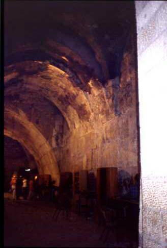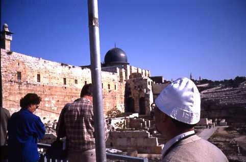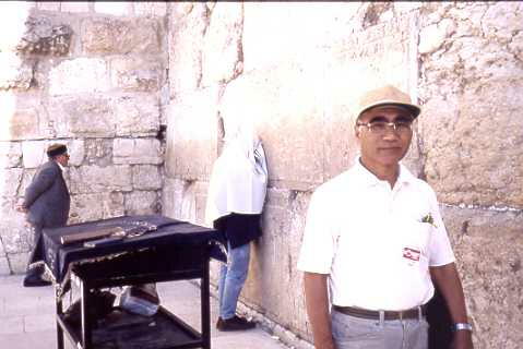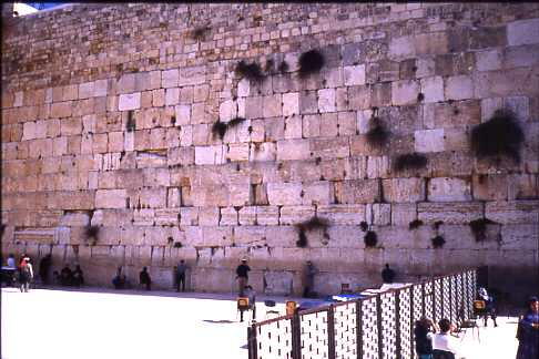 左3分の2は男性の庭で境界線には鉄の柵が置かれている。嘆きの壁はエルサレムがAD70 年、ローマによって破壊された時、この壁のみが破壊から免れた。それ以来ユダヤ人は回復 の日を願ってこの壁の前で祈るのだ。安息日を過ぎたので多少人出は少なかったが、それで も相当な人が例の黒帽子、黒服、黒ズボンのスタイルで熱心にユダヤ教典を読み、祈ってい る。石壁に願い事を書いた紙片を押し込んで祈るのである。無数の紙片が挿入されている。私 も壁に手を置いて主の名によって祈ってきた。嘆きの壁はまた夜露にぬれたあ壁の草の光る さまが涙に似ている所からエルサレムの回復の為に流すユダヤ人の涙とも言われているよう だ。此処に入るには無帽の者は紙帽子を渡されそれを被って入らねばならない。石垣の左側 の入口を入ると広い石作りの室(シナゴグ)がある。その中には更に深い堀のようなものがあ って下を覗くと照明に照らされた古い石垣が見える。それはソロモンの第1神殿時代のものと 言われる。歴史の事実と重みを感じさせられる。(この日の記つづく)