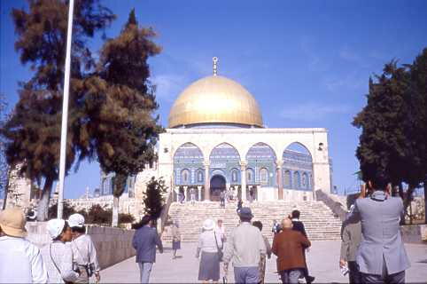 ムでは全員靴を脱ぎカメラは一切不可との事で身一つで入る。堂内は広く高く天井に張られた 装飾の美しさ、精巧さは息を飲む。これがAD700年頃の建造というがどのようにして建てられ たのか古代人の力に驚嘆の他はない。通路は赤の絨毯が敷かれ柵に囲まれた中央には直 径13メートルの巨大な岩が置かれている。この岩こそアブラハムがイサクを捧げた奉献の岩 と言われる。(回教徒は捧げられたのはイサクではなくイシマエルであると信じている由)またマ ホメットが此処から昇天したと伝えられ回教徒の重要な聖地になっているとの事である。とにか く13世紀も前の建造と聞いて驚き以外の何ものもない。 ![]() ![]() ![]()