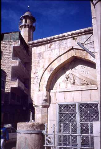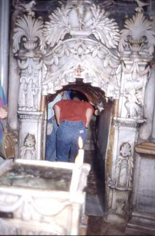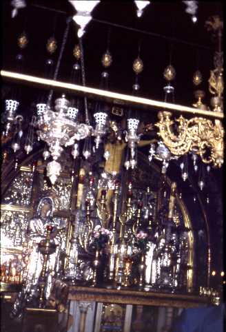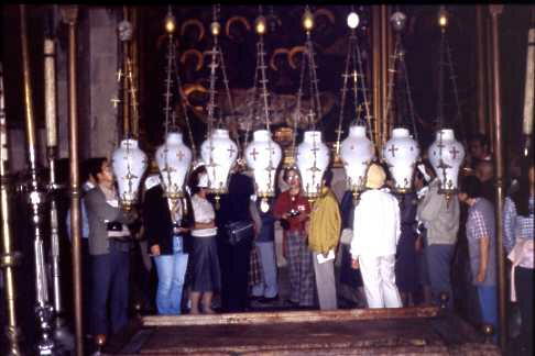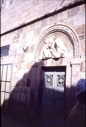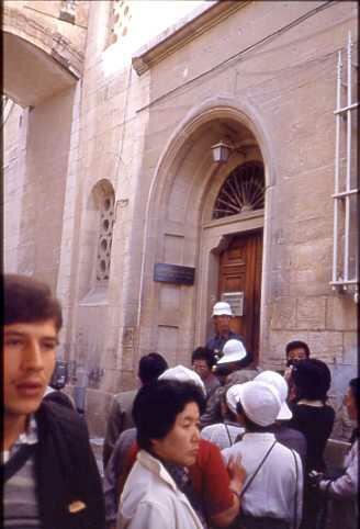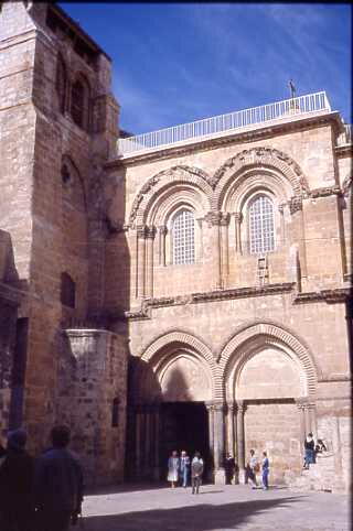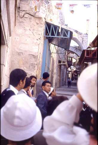 である。狭い通りに橋は片月形にビルとビルの間に掛かっている。最初はアーチ形だったのを エルサレム攻防戦の迷路にするため半分に仕切られ狭めたと言われる。主の苦難の足跡を 記していた。この日はイスラエルへの抗議とかでアラブ人の店は戸を固く閉ざしていた。普通な ら大変な混みようである此の道は人通りが少ない。こんなことは珍しいそうだ。ベンハーの映 画で誤って屋根から瓦を落とした場面があるがさながらそんな感じの建物が両側に建ってい る。狭いアーケードの道には何処に据えられているのかコーラン朗読の馬鹿でかいスピーカー で耳を覆いたくなるほどである。黙々と歩き聖墳墓教会前に到着。石神さんの万歩計によると アントニア城塞からの道のりは約1000歩だそうだ(500メートル位か)。此処は主の十字架、 カルバリの場所である。教会の右側がカトリックの祭壇で、主の十字架が立てられた所。その やや左下には主が十字架から下ろされた所と称し等身大の巨石が置かれている。主が葬られ た墓とされるのは更に左側の方でアルメニヤ教会がある。この聖墳墓教会はAD400年頃コ ンスタンチン帝の母ヘレナ大后によって建てられたのだそうだ。 ![]() ![]() ![]() ![]() ![]() ![]()