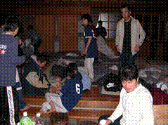 夕食は野外での鉄板を使っての焼肉、温泉につかって疲労を癒し、大広間2つに総勢21名で