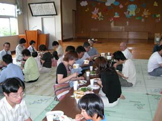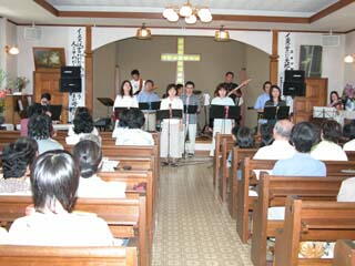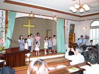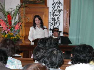 今月の予定はスポーツ。・・・ということで、みんで楽しめる卓球をすることにしました。 すぐ近所にある児童館の体育館に場所を移し、4台の卓球台でダブルスのトーナメント試合 です。NOVAの先生をしているオーストラリアの姉妹が同僚のイギリスの方を誘ったり、フィリ ピン、ケニア、ザンビア、ハイチ、ニュージーランド、そして日本と今月も国際色豊かな交わりの ときとなりました。 卓球を終えてから、教会に戻っておやつタイムでしたが、その後もギターを片手に賛美を歌う グループや語り合う人たちなど、名残惜しさに、しばらく交わりが続きました。 卓球を始める前に祈り会をもち、献げられたものはハイチの兄弟をとおして洪水の被害に苦 しむハイチの教会に送られることになりました。 (文責:原田陽子) から5年生までひとつになってがんばりました。 伝道会前の路傍案内で話す玉城義兄 ![]() 熱唱する子供たち ![]() 劇のひとこま ボーカルは守君、保君、穏君、更ちゃん、頼子ちゃん。キーボードは汀さんと栄ちゃん。ドラム は輝君と咲ちゃん。それぞれに新しいことに挑戦しました。 第2幕は劇でした。「つながれ!」子供たちのそのままの姿を劇にし、その中でそれぞれが神 様に触れていく・・・。一人一人がどう変わっていくか。まだまだ完璧とは言えませんがたいせつ なものが伝わってくるのを感じました。これからが楽しみです。6名の新来会者が与えられまし た。 ◇7月18日白鷹教会にて合同伝道礼拝がもたれました。仙台からは42名が出席い ![]() 白鷹教会で歌う子供たち ![]() 説教、山本盡子婦人伝道師 たしました。梅雨の最中ですが、天候にも恵まれたくさんの新しい方々が礼拝に集まりました。 特別賛美、劇をエンジェルボイスが担当し、メッセージは山本盡子でした。「主のねがい」と題し て語らせて頂きました。ナーマンに使えたイスラエルの捕虜の娘に着目し、イスラエルの家で 育まれた信仰は、どのような環境に置かれても、確かに彼女の中に生き続けていたこと。「喜 ぶものといっしょに喜び、泣くものといっしょに泣きなさい。」(ローマ12:15) 私たちが次の世代に 受け継がせるものはその確かな信仰です。集いました一人一人の心の中に神様が語って下さ ることを信じます。 お昼は両教会でともに愛餐の時を持ちました。 ![]() 愛餐会のひととき 午後は、奥羽教区のユースの方々と共に賛美集会を持ちました。いこいのみぎわアンサンブ ルがノアズ・アークと共に御用しました。教会にあります若い魂に向けてお話がされました。教 会と共に生きることの大切さ、友との交わりの尊さが語られました。多くの賛美を共にうたい、 感謝の時を持ちました。 ![]() 賛美のひととき ![]() 日本ホーリネス教壇白鷹教会外観 尚私達は、白鷹教会での山本出牧師の御働きのために、祈りながら、共に進ませて頂きたい と願います。 ◇7月19日 小学生と付き添い合わせて14名が「ハリーポッター」の映画鑑賞をしました。白 鷹での御用のごほうびに先生方と共に楽しい一日を過ごしました。興奮冷めない彼らは大はし ゃぎでした。教会の友達と同じ喜びを味わうすばらしさを感謝しました。 (文責:山本盡子)