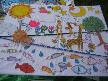 朝は小雨が降っていましたが、曇り空になり、成人科による天地創造のパネルシアター+劇の