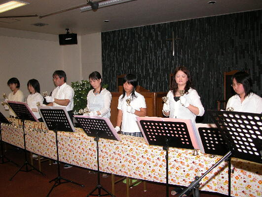 えられ、神への心からの賛美がなされました。ベルの音色の中に、その賛美の詩と、それぞれ の神様への証しを思いながら、幸いな伝道会がもたれました。引き続き、 ![]()