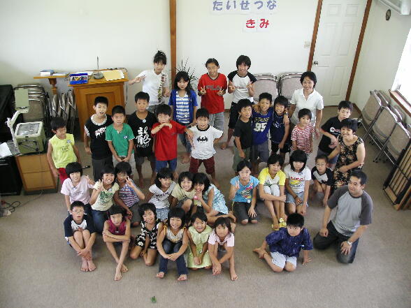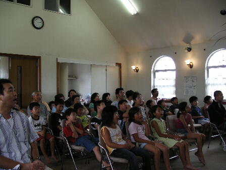 日曜日の朝の伝道メッセージには、招きに応える子どもたちもあり、また飛び入りの岩崎君