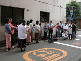 には必ず路傍伝道があります。この働きを通して導かれる方は非常に少ないのですが、長く続 けられている大切な働きです。繁華街に近い教会なので、歩いてすぐのところにあるアーケー ドの入り口を路傍伝道の場所にしています。