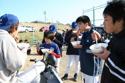 試合後は、婦人会のいも煮、フランクフルト、白玉ぜんざい、コーンクリスピーなど、寒さも吹