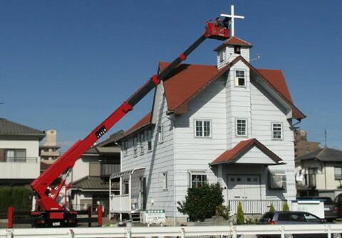 12日土曜日の朝から高所作業車を借りて、台風で痛んだ教会屋根の補修、白い十字架の手
