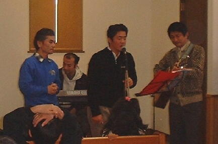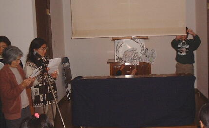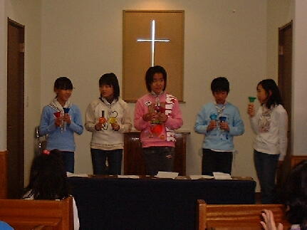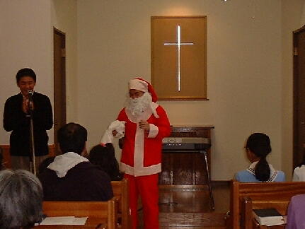 ープサートに挑戦!手作りのぺープサートを上のクラスの二人の男の子が動かし、台詞は大 人が言ってCSメンバー揃って参加しました。またガールスカウトの子供たちも参加してくれまし た。お約束のサンタさんも来てくれて、楽しいクリスマス会でした。 ![]() ![]() ![]() ![]() |