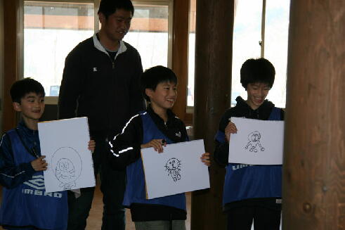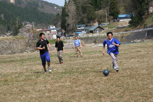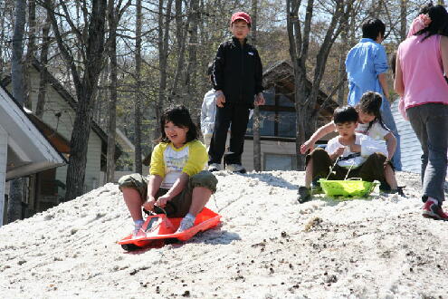 み、でも、勝ち負けにこだわって真剣勝負でした。その他、自由時間は、釣堀、お風呂、山の 散策、山菜取り、サッカー、残雪でのそりすべり、お昼寝etc.それぞれに楽しみました。夕食は 本館にて、山菜三昧、山形牛のステーキに舌鼓、大満足でした。あっという間の二泊三日を終 え、多くの恵みを頂いて無事仙台に帰ってきました。