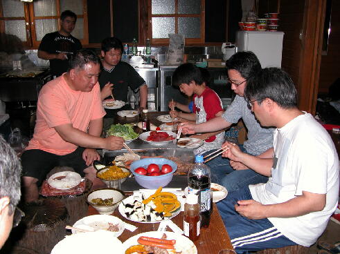 その後、秋保の木の家に場所を移し、合宿です。夜のメニューは焼肉、7キロの肉はそれぞれ