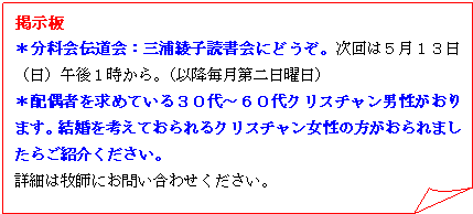 の、また新しく先生なった方もいました。それぞれ、今年の教会学校の目標などを発表してくれ ました。礼拝に出席される方のほとんどは、教会学校にも出席しておられます。これ以上はな い成人科のクラスも、80歳を超えたおばあさんまで、毎週元気に学びに参加しておられます。 幸いな学びの時を感謝しております。