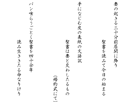 信仰に入り、野沢兄とは仙台の学生時代からの友人です。短歌は35歳から始めました。でも 信仰の歌は難しく、最近になって作り始めています。「聖書」は、2002年の作です。 ![]()