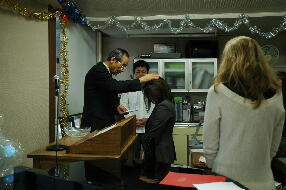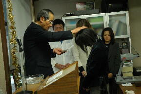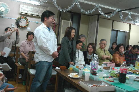 頼下さいました集合写真ですが、双方の教会ともなかなか揃ってという訳にいきませんで、申し 訳ございませんが、昨年末の洗礼式とクリスマス会の写真を送らせていただきます。 どうか宜 しくお願いいたします。中野與子(牧師)) ○12月22日(土)の午後、市内の学童保育施設で、夜は市内大通りで、ゴスペルグループが クリスマスゴスペルライブを行いました。 ○12月23日(日)の午前と午後のクリスマス礼拝で洗礼式が持たれ、午前に1名の方が、午 後には4名の方が洗礼を受けられました。 ![]() ![]() ![]() も大勢参加下さり、持ち寄りの沢山のご馳走が並べられると共に、有志による力作の人形劇、 ゴスペルの発表、ゲームなど盛りだくさんの、楽しい交わりの時となりました。何年ぶりかで久 しぶりに教会に来られた方々も起こされ大変感謝いたしました。 ![]() ![]() ![]() ![]() ![]() ![]() ![]() ![]() ![]() も出席されました。 今年教会に与えられた御言葉、第2ペテロの手紙1章5−7節「こういうわけですから、あなた がたは、あらゆる努力をして、信仰には徳を、徳には知識を、知識には自制を。自制には忍耐 を、忍耐には敬虔を、敬虔には兄弟愛を、兄弟愛には愛を加えなさい。」からメッセージが語ら れ、新しい年をスタートいたしました。