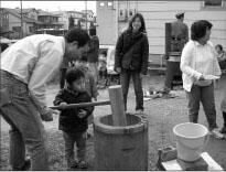 2月11日 教会学校主催のもちつき会は、礼拝堂で紙芝居の読み聞かせなどミニ集会をしたあと、教会となりの空き地での餅を臼 (うす)つき,きな粉やあん餅(もち)のほかに中京教会名物の納豆餅も人気でした。参加者は全員で48名でした。