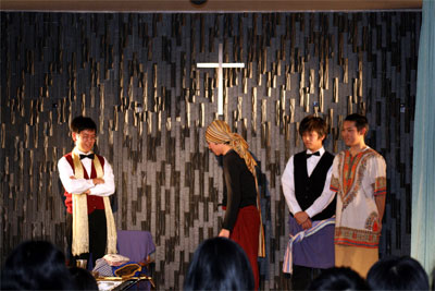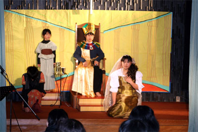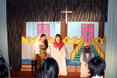 小中学科は、「エステル記」自分が置かれた立場の中で、神様を恐れ、信じどの様に歩むべくかが、メッセージとして演じられていました。モルデカイ役を見事に演じた栄姉に、校長先生賞が贈られました。青年科は、「タラントの例え」を演じ、いつもの男子4人組が、それぞれの個性を生かしながら演じていました。自分の持っている者、与えられたその賜物をどう生かすか…自分だけの為に用いるのか、神様の為に用いるのか、いま彼らが生きている所で、自らにそう問いながら、進んでほしいと願いました。脚本を書きました、遥姉に校長先生賞が贈られました。一年間、教会学校が祝され、多くの恵みを頂き感謝いたしました。