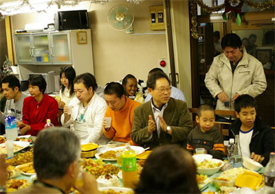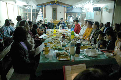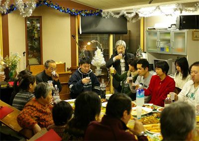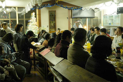 ○12月23日祝日の夜には、合同のクリスマス祝会が持たれ、兄弟姉妹達のご家族、友人、職場の方々も招待され、60余名が集まりました。JSFメンバー達がゲームなど工夫を凝らして、大変にぎやかな会となりました。