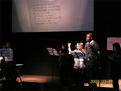 ○3月28日(土)の午後に、盛岡駅近くの県民センター「アイーナ」のアイーナホールにて、インターナショナルな特別伝道集会が開催されました。今回は英語礼拝のメンバー、特に今度帰国する兄姉達が伝道メッセージやお証し、特別賛美を多く担当しました。兄姉の家族、親族を含めた15名ほどの新来会者が与えられ、久しぶりに顔を見せられたり、遠方から応援にかけつけて下さった方々もあったり、ナイジェリアの兄弟とお友達になったモルモン教会の若い宣教師4名の青年達も参加されました。