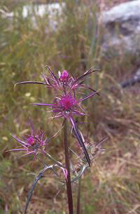 冬の間は地面近くに生えていたものが、春とともに大きくなり、その先にあざみのような花が咲く。葉はマリアアザミのように白い縞模様があるが、やや葉は小さく、花も異なる。